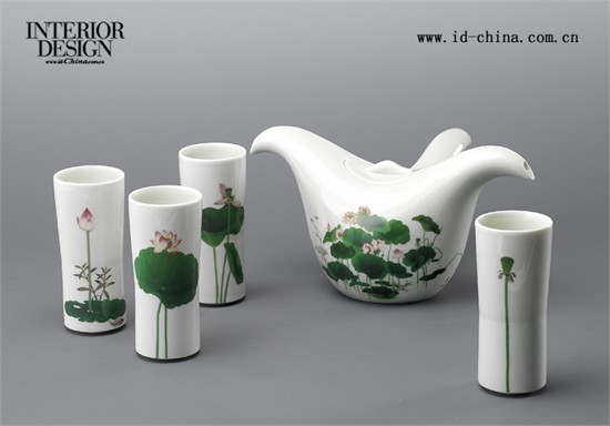 《莲池》为林玉山代表作之一,曾获第四届台湾美展特选第一名及台展赏,亦为国立台湾美术馆镇馆之宝,画中描绘荷花枝叶生态风骨,细致典雅,堪称台湾胶彩画发展史上瑰宝。画中元素搭配同样以水生植物为设计概念的菱角壶,呈现出由原作古典气质延伸出的现代感官诠释,独具一番生动巧妙,茶如莲池清水,于壶杯间卷香流动。