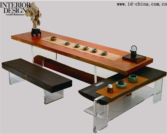 茶席家具由大茶案、备茶几、茶凳组成。用材使用亚克力与两种木材穿插组接。木材分别选用花梨木和鸡翅木,整组家具素淡无装饰,充分体现木质自身色泽肌理的美感和能量,大材朴作,气质简练雄浑。现代材料亚克力的对比运用赋予了传统木质家具新的空间和视觉感受,与空灵静寂的的茶席气质浑然相成。