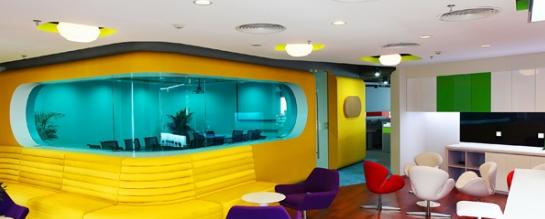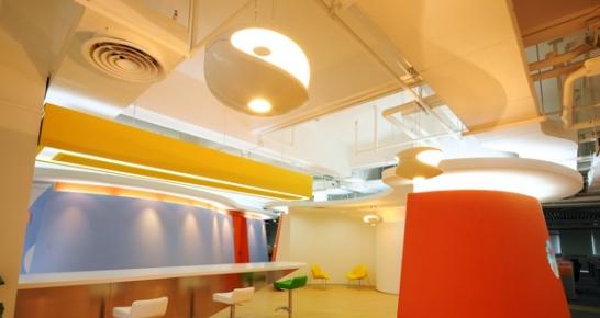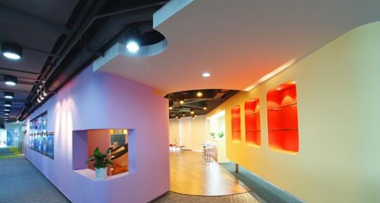 这是腾讯在上海的办公空间设计,明显的科技型企业的设计风格,清新活泼的色彩,极具概念性。
