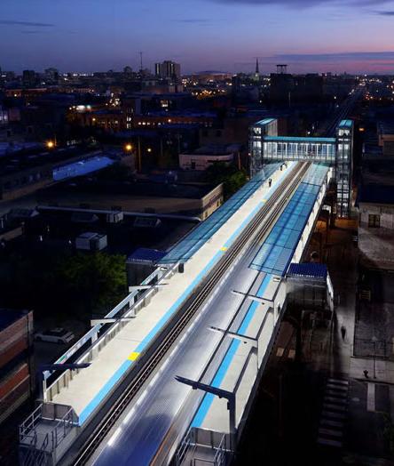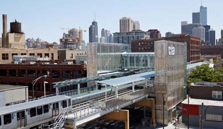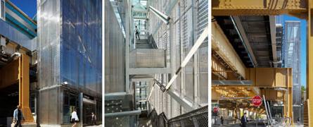 车站平台没有采用传统的木材,而是用混凝土板来增强强度,也便于维护。车站的外层很多都是用不锈钢打造的,反射出芝加哥不断变化的季节和道路上的情景。材料的选择有利于车站的清晰可辨,也强调了开放性。