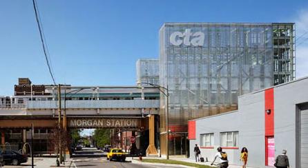 摩根街车站位于芝加哥富有历史性的富尔顿市场区(Fulton Market District),它的建造有助于改造当地工业地带的特性,转换成具有多样性的邻里。Ross Barney事务所在材料的选择上参考了附近建筑的特点。