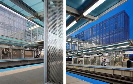 站台上方的顶棚是用半透明的聚碳酸酯板材搭建,既提供了遮挡,又让自然光照投射进来。轻质板材也很容易在将来被更换。步行桥、升降梯外挡板和底层的入口处等大多采用透明的玻璃,电梯井和栏杆等采用穿孔不锈钢板,这些都是为了彰显开放的空间。