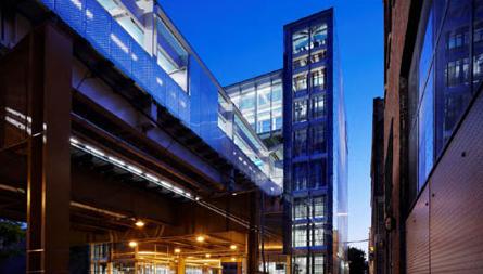 新车站位于摩根街和湖泊街的拐角处,非常显眼,也易于人们到达。湖泊街种植了新的树木,辅以景观设置和自行车道,弱化了原先工业区的色彩。清晰宽大的拐角使得步行者和司机都能很清楚地看到这座车站,而且安装的高科技摄像头也保证了行人和骑车者的安全。