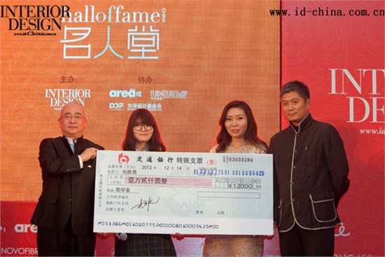 北京光华设计发展基金会理事长张琦先生、美国《室内设计》中文版执行出版人王潇女士、王开方艺术设计工作室创始人王开方先生一同上台为刘胜男同学捐赠助学金人民币一万二千元。