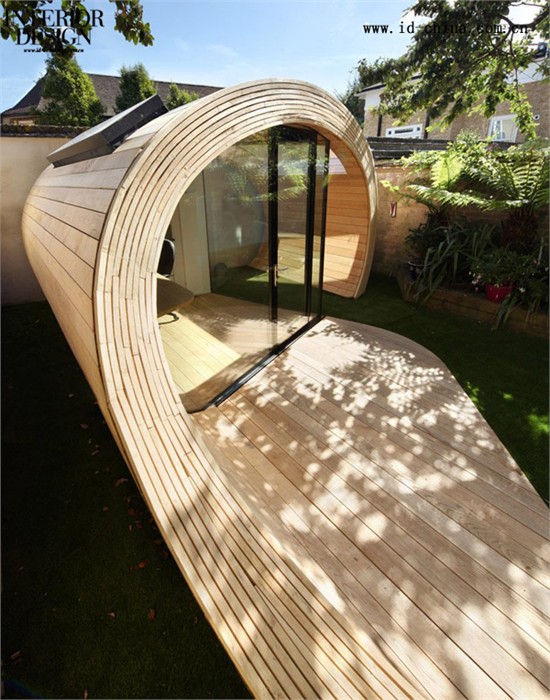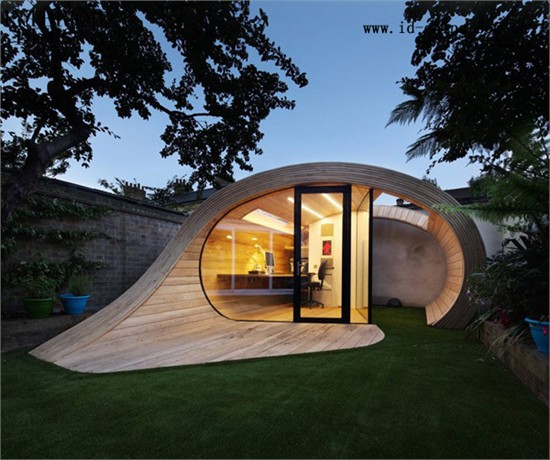 结合功能性与雕塑设计,Platform 5建筑事务所的创意头脑构思了位于伦敦的这件作品。Shoffice 是位于圣约翰树林一座1950年露台住宅后方的花园凉亭,展现梦幻的外观。业主需要“雕塑般流入花园中的建筑装饰”。建筑师因此构思出展开式,木质建筑装置,非常适合用作办公室或棚屋小憩。