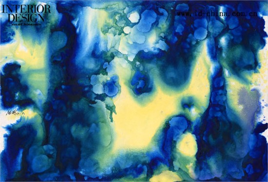 这次展出的作品《天界》,普蓝与群青构成的深重色调中,像是千仞的崖壁,扑面而来,有雷霆万钧之势,细细观之,沉淀出了无数白色和黄色沟壑的细部又是那么自然天成,在水彩纸上采用了国画传统的“泼墨法”、“积墨法”和“破墨法”等多种表现手法,画面既抽象又具象,奇绝而震撼。