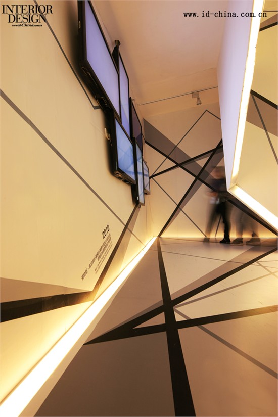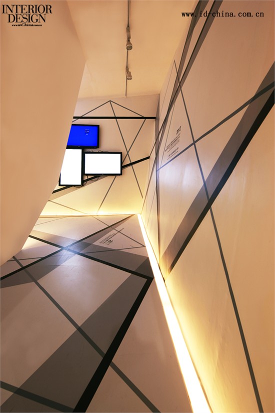 展位外观以纯白色为主,显得雅致、大方,远远看去就像一个打开的盒子。而盒内则另有乾坤:多面墙身布满繁而不乱的大小线条,错落有致。以展位入口的一条黑色牵引线为主线,沿着起点——从脚下延伸到达墙面、交汇转折、继续延伸......并与其他辅线互相交错,渐渐铺满整个空间。每个线面交汇点,均代表着汤物臣成长路程中的重要里程碑。一块90度转角的超大投影幕循环播放着汤物臣十年以来的经典之作,迅速抓住视觉,让人忍不住驻足,一探究竟。从你步入展位的第一秒开始,汤物臣十年的历历足迹便如一幕幕剪影画般在你眼前呈现,又仿若展开一段时间与空间的跨界对话,带来印象深刻的创意体验。值得一提的是,整个空间的构成绝非各自独立。若将空间从入口依次展开来,则是一条半弧状、线面串联、循环围绕、完整相接的线,隐喻一条无限延伸、没有终点的路,也巧妙的呼应了本次设计的主题——“路上”。