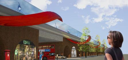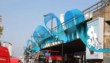 按照这个方案,蓝色的螺旋结构和红色条带盘旋于一座高处的平台上,也就是将自行车道悬垂于空中形成网络。它连接着伦敦各处的主要铁路线。