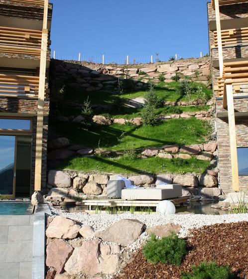 酒店坐落于著名Seiser Alm,壮丽的自然景观,令人印象深刻。酒店的水元素体现的淋漓尽致,天然的石材幕墙,木框架结构与周围的景色相互呼应。