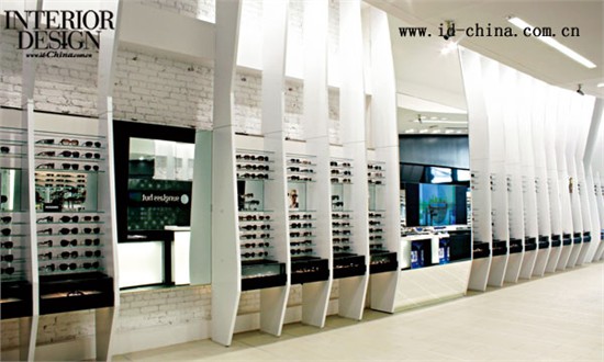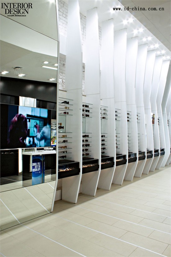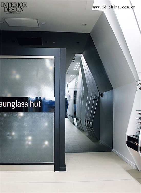 当罗萨奥迪卡集团(Luxottica Group)让EOA(Elmslie Olser建筑师事务所)为Sunglass Hut品牌制定一个旗舰店的构想时,这些主管们会发现Robin Elmsie Osler的心里充满了海洋情结。为了让这处面积达140平方米的SoHo店具有不同一般的特色,她考虑采用的是造船行业所独有的结构技术,最终的结果是将整个一面侧墙用一排从地面到天花板的喷漆鳍片进行装饰。鳍片的上端装有架子,下部是封闭的储物柜。鳍片之间还有一个Social Sun工作站,这个工作站可以解决顾客挑选多种品牌时,所不能直观在线看到自己形象的问题。顾客甚至可以把自己的图像通过电子邮件发给朋友。无所不在的LED灯照亮了白色涂漆的砖墙和白色的水泥地板。商店里光线是如此的耀眼,让你情不自禁地要戴上一副太阳镜。