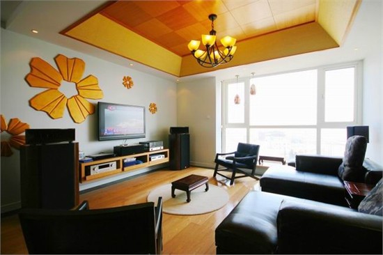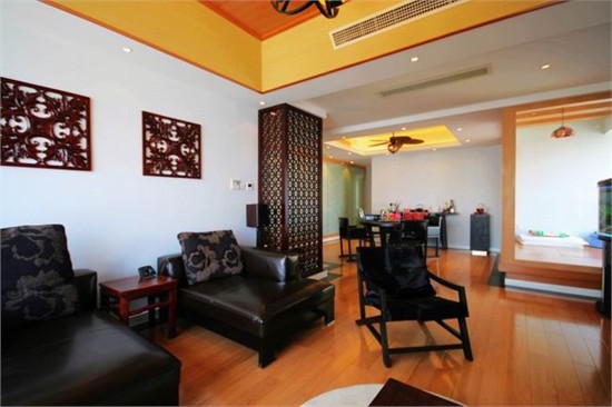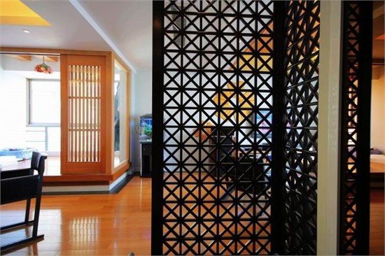 暗金色的压花,暗暗的镜面,班驳的青石,光滑的地板,质朴的原木,风格浓郁的配饰,创意中式风格。