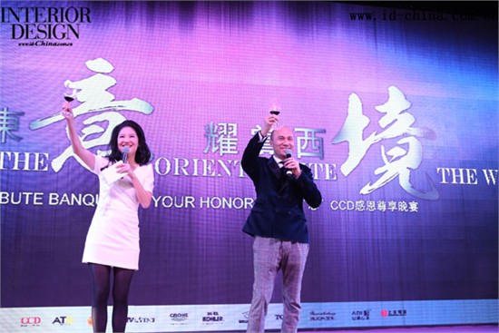 凤凰卫视著名主持人周瑛琦小姐(左)与CCD的董事长兼设计总监郑忠先生(右)一起祝贺CCD位列“全球酒店设计第四” 以及囊括包括“GOLD KEY AWARDS金钥匙”大奖在内的11项全球大奖。