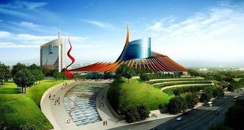 “山高人为峰”正是我们神农大剧院的建筑设计主题。在株洲,在神农城, 我们纪念我们的先祖,颂扬神农氏对人类生存发展和进步的贡献。神农大剧院的建筑造型,采用“人”字的罗旋上升的态势。建筑与环境得以紧密结合,在起伏的山丘上一座曲线优美的建筑拔地而起,象一座圣火燃烧的圣坛,热情奔放,活力四射,似现代文明为褪去的台地拔起的峰峦,是神农文化与株洲城市精神的有机结合,极具标志性与纪念性。