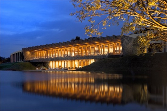 客房被放在13立方米的模块里,模块的外表皮是混凝土预制板,模块和模块之间有间隔,走廊将他们串起来。行走在走廊中,穿行在从模块中透过的光中。选择的材料都是天然的,营造的气氛如同上世纪50年代圣保罗农村度假村那般舒适低调,优雅朴实。