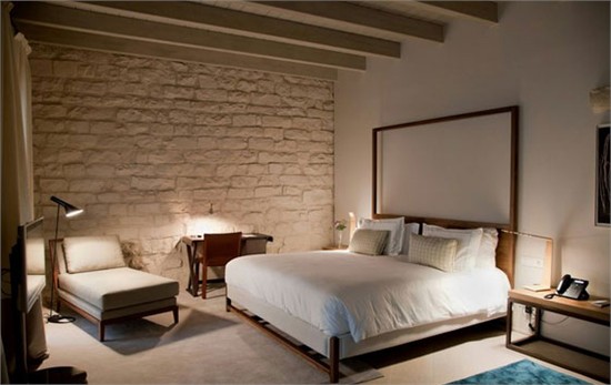 这是一家位于巴塞罗那的酒店,裸露的砖墙设计,原始老旧的感觉,柔和的灯光照明,营造了一种温馨的氛围。