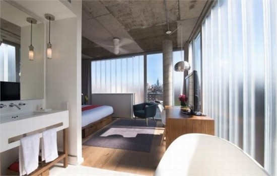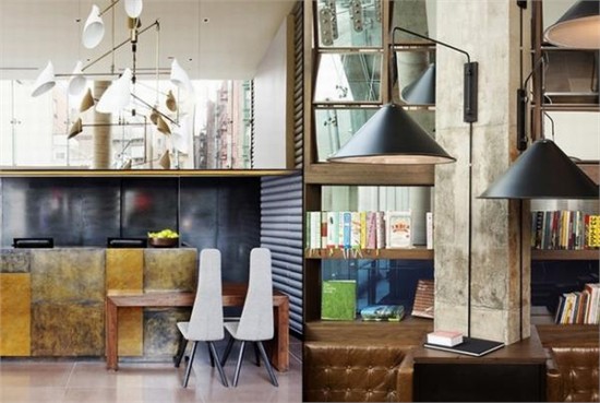 Nolitan Hotel是位于纽约市Kenmare街和Elizabeth街交叉口的精品酒店,外观就很有意思,它是完全在一栋老式建筑旁边加盖的新楼,令两者融为一体,颇有建筑大师Frank Gehry的风格。不规则的落地窗设计和黑白分明的色彩则赋予这座建筑以纽约市的现代简约,尤其是夜晚更显得醒目。Nolitan总共有55间客房,在内饰的设计上则同时融合的简约大都市和美式乡村两种风格,由Grzywinski+Pons负责整体设计。