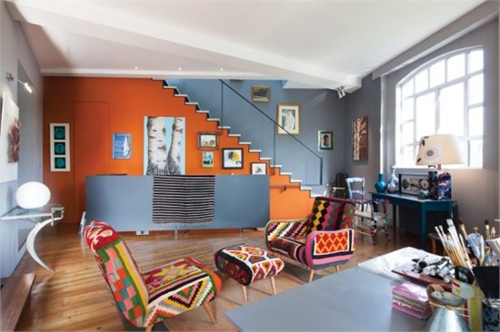 这是一间位于伦敦的公寓,丰富多彩的颜色和纹理,整个空间都弥漫着艺术的气息,蓝色和灰色的房间与一个疯狂的吊灯,充满自然光的玻璃墙与民族风格的家具,老式木制艺术品,多姿多彩的一个疯狂空间。