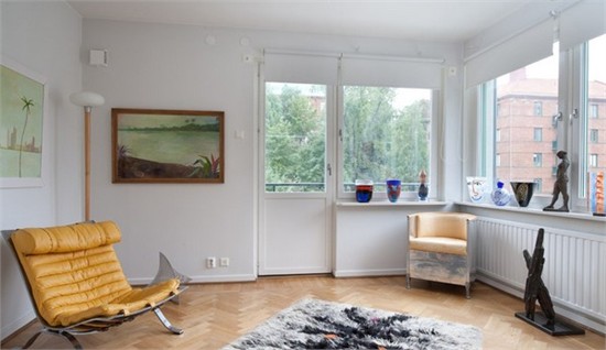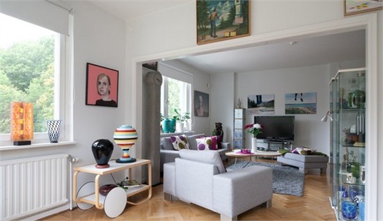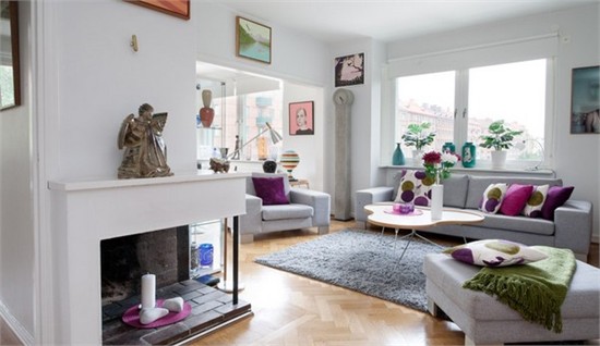 这个公寓的总起居面积为98㎡,分为四个房间,整体氛围温馨而生动。一个宽敞的开放式起居室沐浴在自然光线之下,里面摆放着各色家具组合,这些明亮欢快的色彩也奠定了整个房屋的基调。起居室也是家人朋友聚会的地方,因此室内装饰也倾向于给人一种友好的氛围以及暖烘烘的社交气息。优雅现代的白色沙发组合、大方简约的壁炉设计以及一张自然形态的咖啡桌,构成了起居室的大体格局。而画作、雕塑等各种艺术品、色彩缤纷的抱枕及花束则营造出房间整体的生动、欢快氛围。除了三间散发着迷人气息的卧房以及一间现代感十足的厨房外,这个小公寓还有多处位置绝佳的露台,可尽享平静怡人的城市风景。