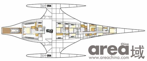 舷外支架的高度被进行了优化以便于海上移动,新的舷外支架形状用以增加在波浪中的稳定性。我们对游船所有的主要部件都采用最新的结构分析方法进行了分析,以便能够为实现低燃油消耗而降低重量。所有的这些努力最终都导致了一艘无与伦比的游艇的诞生。游艇最近在中国珠海的 McConaghy 造船厂下水。阿达斯特拉16米长的船宽在主甲板上开辟了一个十分宽敞的休息区,通过全景窗户可以看到华丽的景,那里还包括一个酒吧区,一个就餐区和一个驾驶台。通过休息区窗户旁一个朝前打开的门可以方便地走到前甲板上的日光浴床边。后甲板左舷装有沙发和吧台,右舷是就餐区,再靠后边是一个可以容纳一条4.9米长橡皮艇的空间,下边是一个可以存放一条3.1米长橡皮艇的车库。车库的门设计成可以通过折叠方式形成一个大型的跳水台。甲板下面通过将中央龙骨稍微地向上扩展到水线以上而留出了更多的空间。这个空间被分割成两个部分,一个是位于后部、横跨整个船体宽度的主人舱室,可从上层甲板的休息区进入,另外还有两间客人舱室、船员舱室以及位于发动机舱前部的厨房。阿达斯特拉可以为9位客人和最多6位船员提供舒适的居住环境。主驾驶台带两个座位,位于升起的操舵室里,操舵室介于后甲板和休息区之间的位置,构成了横梁结构的一部分。一个 Simon2 集成船舶监控系统负责对游艇的燃料、安保、泵传感器、电气、照明等系统进行监控。游艇配备了全自动的燃油管理系统,其中包括一套用于清洁燃油的 Alfa Laval 系统。游艇的抛锚系统极为独特,三个锚全部由碳纤维滚筒绞盘驱动,由液力系统提供动力。主锚是定制的130千克 Bruce 式船锚,从右舷船翼处抛出。