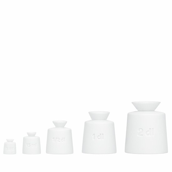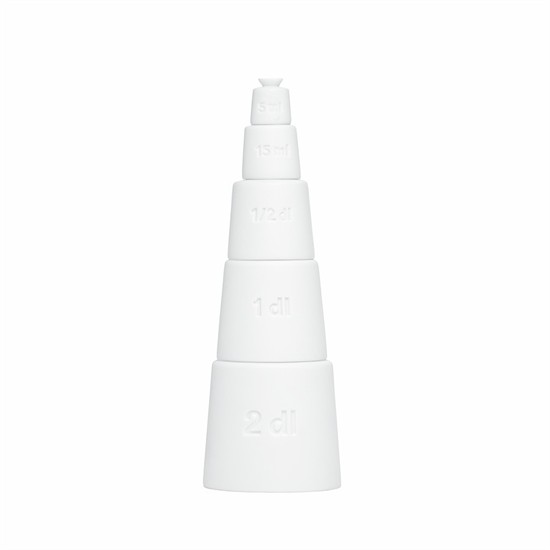 设计师使用白瓷制成的轮廓,简洁清晰,形状类似于天平,它们的刻度被雕刻在上面。“塔”量杯外面不光滑,里面光滑,不用时,可以叠放成一座小塔,或者如果你想节省空间,可以一个放在另一个的里面从而减小物品的尺寸。所有量杯可以安全用于洗碗机。该包装也由Monica Förster设计,加强了该项目的微建筑面。