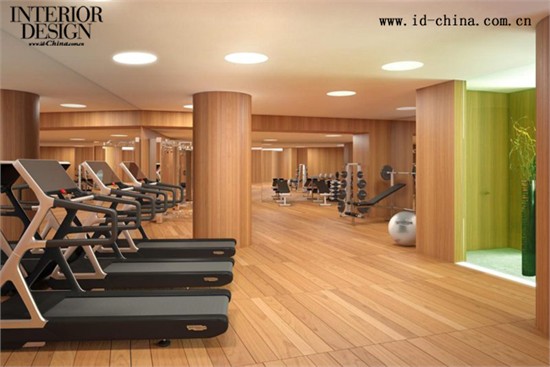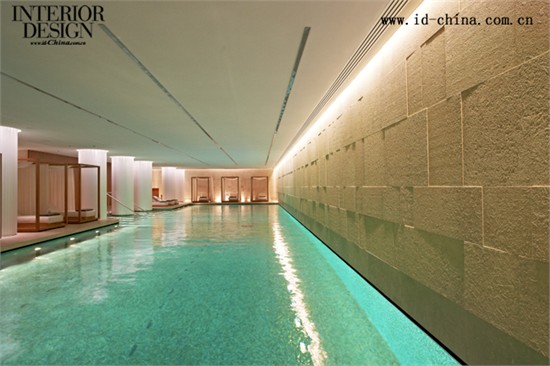 水疗中心是伦敦市中心最大的水疗场所之一,拥有一个带3个泳道25米长的游泳池,平铺着最能代表意大利玻璃马赛克艺术的金箔马赛克活力池。游泳池内衬马赛克有绿色和金色的细微差别,而墙壁和地板均采用喷砂维琴察石料。游泳池周围的柱子采用带织感的甲基丙烯酸甲酯块材料。维琴察石料最出名之处是在帕拉迪奥建筑上的应用,这里则是铺贴在墙壁和地板上,引领着水疗中心的其它领域。由于其孔隙度和清晰可辨的化石遗骸,维琴察石头具有很强的特性,具有自然的感觉,眼睛看起来舒服,脚踩上也很惬意,就像赤脚走在沙滩上一样。代表自然和健康理念的其它材料是橡木,染成如干邑白兰地酒般的金色色调。