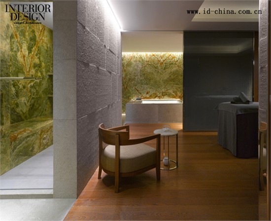 水疗中心设有12间理疗室,包括一个内有更衣室的特殊双套房,蒸汽淋浴和私人休闲室,双重水力按摩浴缸和墙壁的绿玛瑙,进一步突出了其独特地位。与理疗室相邻的是针对不同性别的桑拿、土耳其浴、冰淋浴和普通淋浴,都可通向休息室,完全由维琴察石头内衬,并配有一个大大的垂直壁炉。水疗中心还全方位服务,包括嘛呢(mani)/足疗沙龙,美发沙龙和一个专享健身室,健身室完全由干邑色橡木饰面,并配备最新的健身器材。在水疗中心的接待区,维琴察石地板和橡木墙壁,中心元素是由绿玛瑙、玻璃和背后照光的前台。通向私人理疗室的楼梯全部采用木质材料,而墙壁则由维琴察石料和绿色的玻璃装饰。