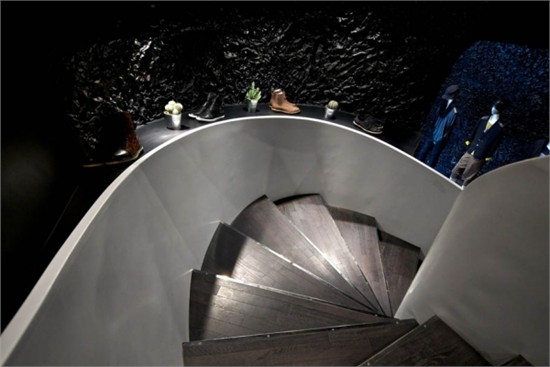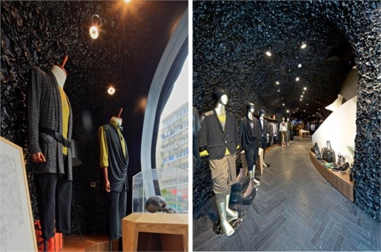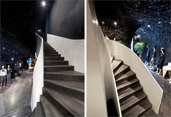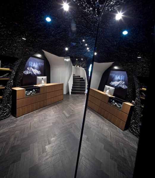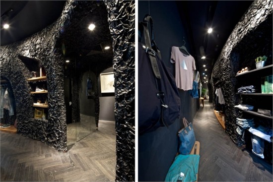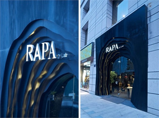 现有服装店铺的设计,大多被主流服装品牌店铺模块化易推广的惯性思维观念,统一而单调的品牌视觉体验所羁绊。设计师在对品牌思想的理解与剖析后推出了一个完全基于创新建立的 RAPA 店铺计划。以凸显店铺个性或地域属性颠覆传统旗舰店的恒久性,以反模块设计挑战固定格式崇拜,彰显了漠视一切常规的智慧。空间表现上结合RAPA 跨界无形的品牌特点,利用材质锡纸不规则不确定的特性,加之电镀工艺赋予其乌黑色金属质感,一个超现实的洞穴得以呈现。通过多元无形、无局限的方式来表达RAPA 品牌的创意价值。