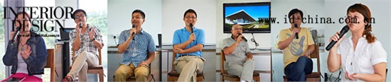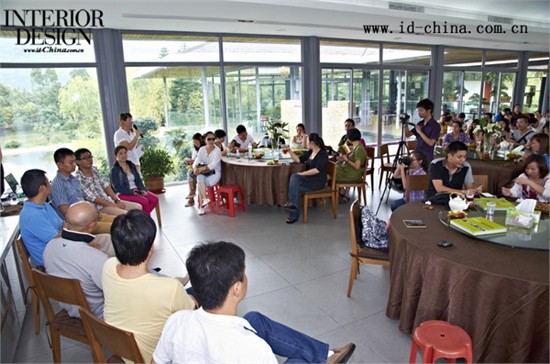 沙龙嘉宾分享感受 人物从左至右:资深建筑师伍颖梅、国际室内建筑师与设计师理事会(ICIAD)LEO李勇、林间会所业主代表孟凡元、秀城设计总监陈颖、知名设计师林文格、腾讯•亚太家居COO兼总编王建国、《现代装饰》执行主编燃燃(主持人)