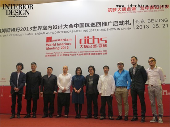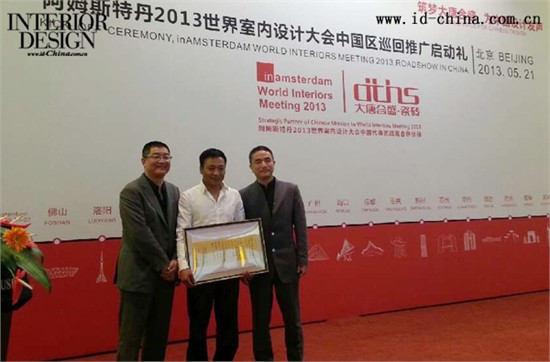 WIM中国区官方代表机构总负责、IFI执委、广州国际设计周执行总监张宏毅(左一)与金堂奖发起人、中国建筑与室内设计师网董事长谢海涛(右一)携手2013WIM中国代表团发出倡议书