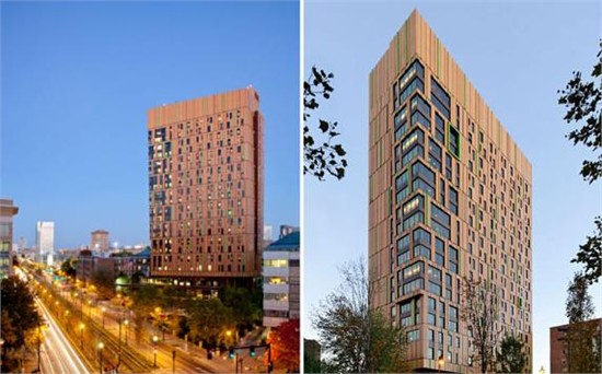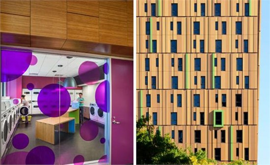 21层的宿舍楼面积为14.56万平方英尺,底层设置了咖啡馆和起居室,二层由健身中心,三层是厨房、游戏室、洗衣房和健身室。剩余的17层都是宿舍,包括136套一间卧室到三间卧室的房间。