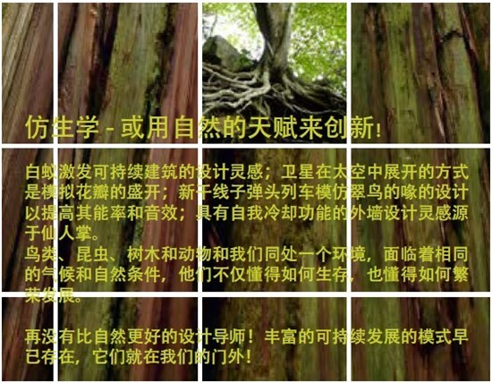 白蚁激发可持续建筑的设计灵感;卫星在太空中展开的方式是模拟花瓣的盛开;新干线子弹头列车模仿翠鸟的喙的设计以提高其能率和音效;具有自我冷却功能的外墙设计灵感源于仙人掌。鸟类、昆虫、树木和动物和我们同处一个环境,面临着相同的气候和自然条件,他们不仅懂得如何生存,也懂得如何繁荣发展。再没有比自然更好的设计导师!丰富的可持续发展的模式早已存在,它们就在我们的门外