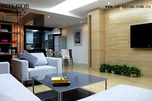 YOU DESIGN STUDIO 刚完成的一间两个年轻人生活的公寓,为考虑到未来小孩的活动空间,设计上尽量采用开放式,让面积本来不是很大的户型腾出更多活动空间,直接用简约的书架,半透的钢化玻璃海报作为了区域隔断,在色彩上用黑白灰做为基调,耐看时尚,也是大多数年轻人喜欢的色调,电视墙的暖色和沙发墙的暗红色,增加整个空间的温馨感。