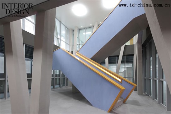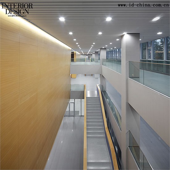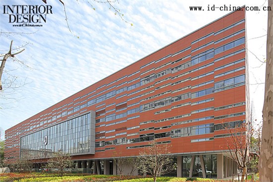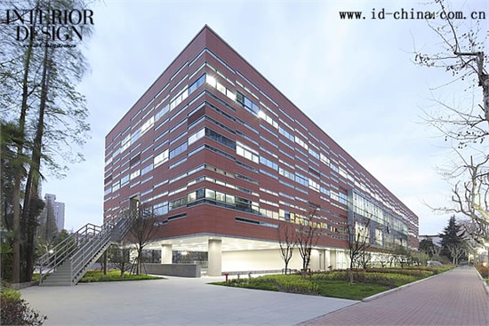 建筑被设计为上、下两段,并各具独特的功能:下段作为公共区域和图书馆,由树枝状柱子组成支撑系统,支撑上段庞大体量的教室和办公室。为了建立与交大早期古典建筑红色面砖的呼应,在设计中需要特别关注的是挑选材料和设计元素的合成。因此,我们选择了一系列的材料,例如红砖水泥的外墙和透明或反射的玻璃窗带,演绎出一种现代元素和校园历史环境相交融的意境,创造出历史延续与当今环境相协调的感觉。这种“合成”着意于现代元素,强调自然天性的发展和大学的时代感,并给予校园一个全新的未来标记性符号。
