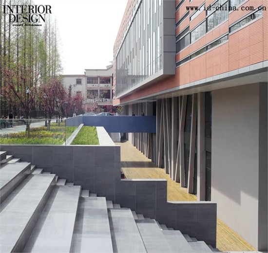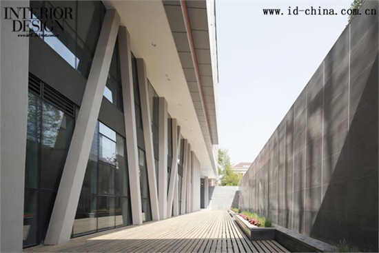 为了给予建筑的地下层足够的自然采光,并增加可用面积,其被设计为离建筑红线6 米的下沉式庭院。这是一个让人平静写意,面朝图书馆的庭院,特别适合会谈和沉思。在庭院西面的尽头,有一个室外剧场,整个空间被上方建筑漂浮的体量所遮蔽,可以举办小型演出,并可在夏日享受别具一格的“天蓬”。值得一提的是,这个区域自然通风的特色,新鲜空气由北朝南从树林中,从水中自然的流入,给整个公共空间一个自然舒适的感受。