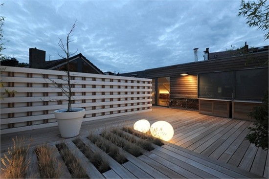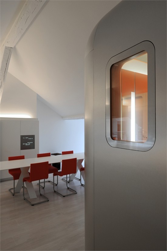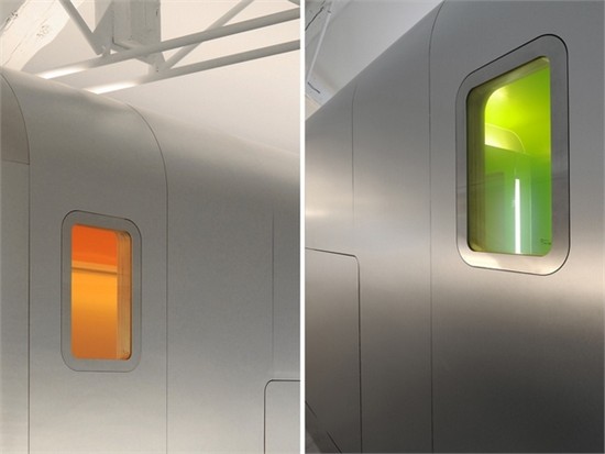 圆形模块表面覆盖了一层铝板,带有蒸汽拖车的独有的空气动力学美感。室内三个舷窗玻璃采用了比利时艺术家jean gilbert建议的饱和色调。以白色为主的室内空间促进了间接光线的照射,突出了圆形模块的磨砂铝表皮。干净的线条和简洁的色调创造了一种失重感——低调而高科技的家具设备又加强了这一感觉。建筑师仔细的推敲了落地窗和视线的位置——居住者可以从室内俯瞰街道景色或是走到宽敞的露台上。露台几乎是居住空间的两倍,让居住者可以直接与邻里建立联系。