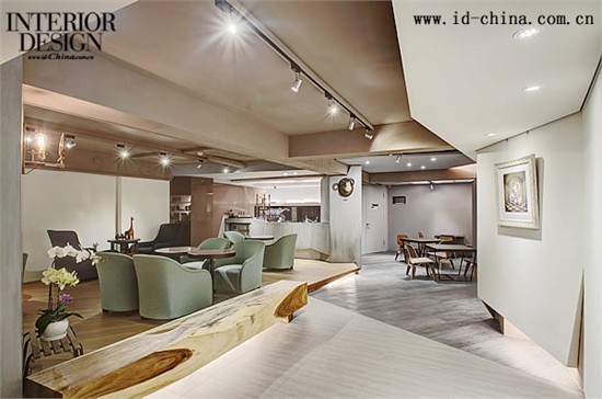 户外则以大面落地窗纳入采光,并增加视觉的延伸深度,其余外墙作纯白处理,强调临近建物的视觉差异,运用企业识别系统,延伸至大门手把,以及入门迎宾的小招牌,在简约中夹带触觉及视觉的趣味。材料选择与色彩计划的搭配,包容风格多样的家具与装饰品,合宜的作为饮食,商品与文创美学展示的基底,避免喧宾夺主的前提之下,呈现一种截然不同的中性美学。