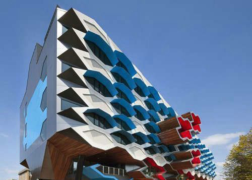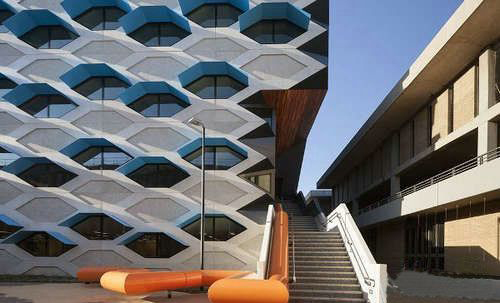 主楼梯在建筑的中央向上攀升,连接着学生学习楼层与研究楼层,这也是科研“途径”的一种表现形式。建筑外表皮的细胞状结构是为了表达正在校内进行的主要分子研究,而且通过建筑的材料性与建筑本身而得到调整。墙壁主要为预制混凝土,在各个空间都安装有“低层”和“上层”窗户,有助于日光照射进来。蜂窝概念还为许多特殊的学生用空间都创建了框架,或者为研究人员的聚会和合作创造了条件。