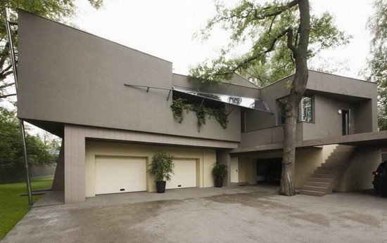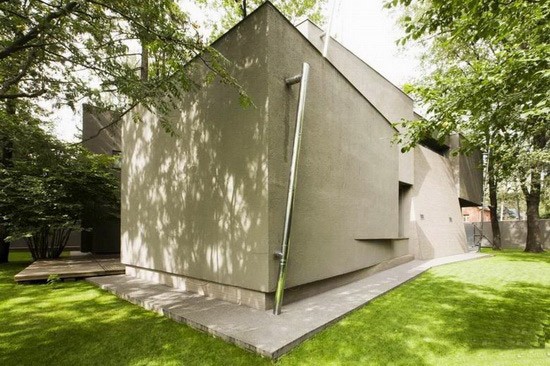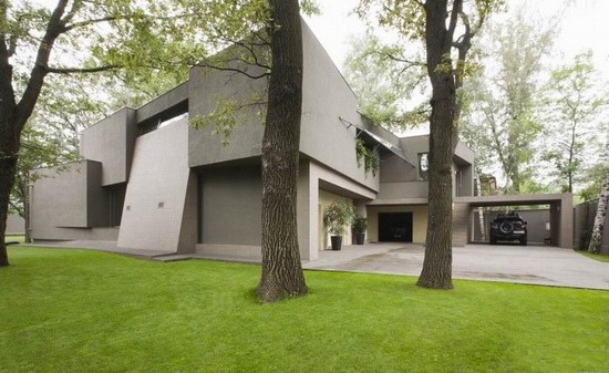 Mr.R并不是害怕那种千篇一律的建筑表现风格,他是排斥当时莫斯科建筑界所流行的鉴赏家对那种风格冠以的名字。屋主的唯一条件仅仅是保留宅基地上的所有树木,这就是为什么在这处原本已经不算很大的1800平方米的土地上,建立了这栋占地面积只有300平方米(建筑面积560平方米)住宅的原因。这栋建筑由固体铸钢筋混凝土框架和泥墩,桥接以及砖墙共同打造的。有一部分墙是倾斜的,给一向是盒子状的建筑带去新鲜感。