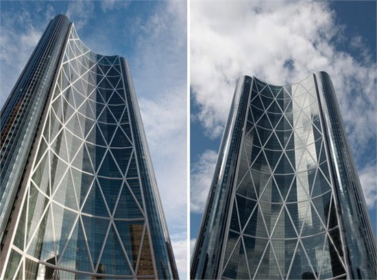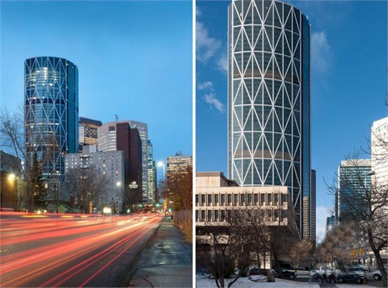 事务所高级合伙人Nigel Dancey介绍说,这栋高楼的形态来自卡尔加里独特的气候条件。建筑坐北朝南,有六层高的空中花园、咖啡厅和会议区,营造出舒适的办公空间。在建筑底层部分,有15条封闭的桥连接到市中心的商店、咖啡馆和广场,与城市活动相渗透。这个建筑的每个方面,包括架空的楼层和斜肋网格,都设计得十分高效。建成后,这个弓形写字楼就成了卡尔加里市新的象征。