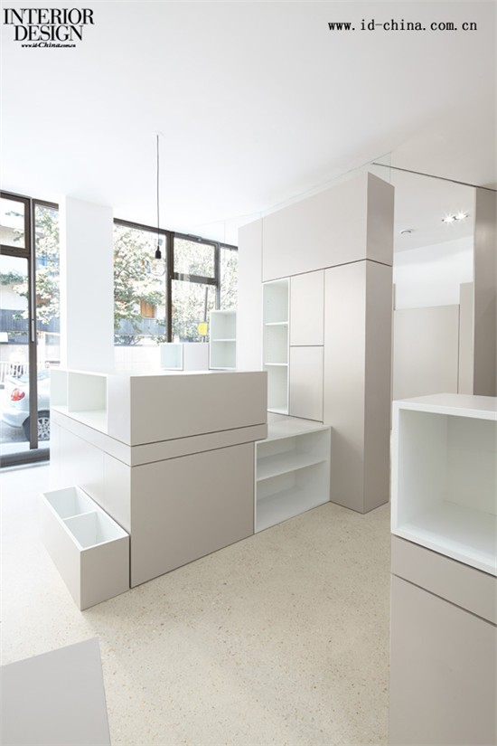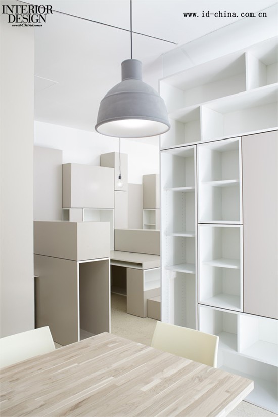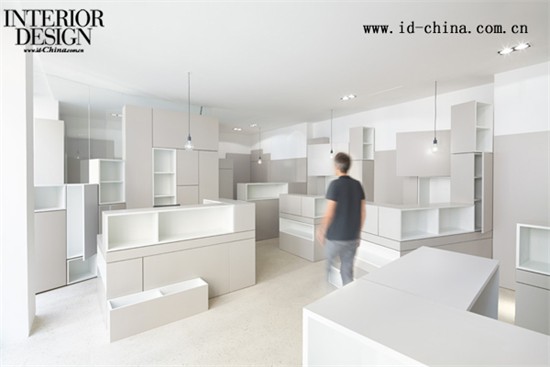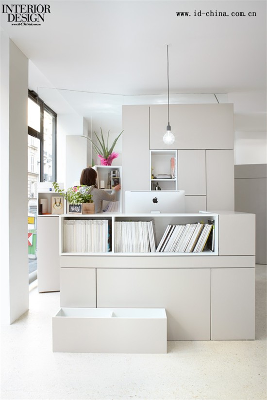 当然,项目在启动之前的预算就很紧张。该空间在设计前是一个原始的毛坯房,房间的以纵向的方向布局,面朝街道。对H2O 建筑事务所来说,第一步很容易想到的就是要做一个长度跨度整个室内的玻璃橱窗。Santiard和他的同事Charlotte Hubert、Jean-Jacques Hubert在解决模块化安排之前,最初提出了三个“情景”方案。该方案主要由5个工作区组成,在各工作区配置大量的盒型物体以供摆放电脑服务器、文件夹、书籍以及其他办公必需品。