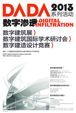 “DADA2013数字渗透”系列活动,通过数字建筑设计专业委员会(DADA)国际学术研讨会及其同期举行的展览和竞赛等相关活动,旨在聚合各界智者的深入研究和远见卓识的思想启蒙,创建国际和国内数字建筑领域的重要交流平台,推动数字建筑设计和数控建造技术的发展,以及渗入到日常的数字化生活方式,同时也希望发掘出新一代优秀建筑师及设计师。相关具体内容可参见DADA网站:www.dada.org.cn。