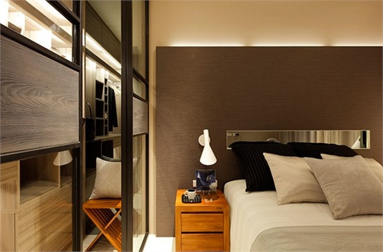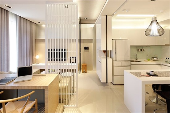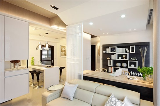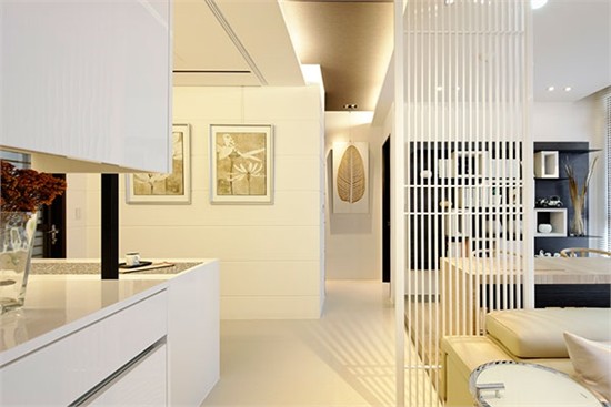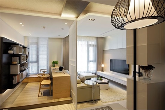 本案是一个一居室的小户型,属于复合混搭风格。空间高度集中,吊顶、隔断、材质的变化将区域划分的很明确,面积虽然小却充满层次感,不凌乱也不平庸。隔出的一片书房意境优雅,很明显的有放缓生活节奏的功效。浅色调的客厅显得空间更大,怡情舒适,卧室的设计则增添了阳刚的气质,感性与理性交融。