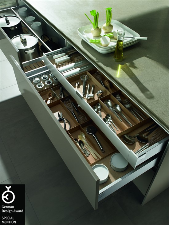 别具匠心的材质混搭﹑体贴入微的细节关注:SieMatic SF10抽屉内饰系统的出色设计及优质功能得到德国设计协会(全世界最具声誉的设计协会之一)的充分肯定,在2013德国设计奖评选中荣获家居装饰类“特别推荐奖”(Special Mention),同样获此殊荣的还有Audi﹑Mercedes-Benz等著名品牌。