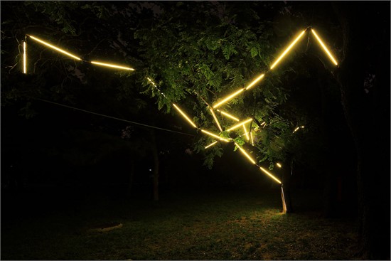 设计这个作品的灵感,来自艺术家日常收发的短信;有些短信发送成功了,有些短信也许遗失在时空的某个缝隙中、残旧楼房的天台、荒废的街道旁、湖边。艺术家用灯具做成了Hey这个字,进而把这个秘密用视觉的外化语言代谢出来。