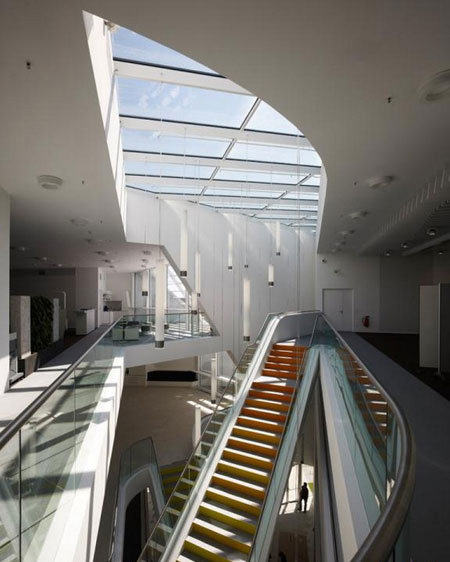 经历了紧密的分析阶段后,各个设计要素在空间组织中得以实施。工作区域各自交融,推动了跨学科的工作进程。透视般的参观路径中,明亮色彩的楼梯成为了导引的标志。立面和内部空间的颜色也不同,指引人们去往办公室或实验室。建筑结构中包括一部分泡沫板天花板,这既是替换混凝土天花板的一个较为经济的手段,也减轻了份量,增加了没有梁柱的空间的面积。