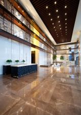 大堂每个角落均展露出自然材质与形状之间的协调。墙壁的浅色木材营造出幽静的氛围,而暗沉的色调与浅黄色石地板形成强烈对比,为空间确立明显界线。亮丽的云石配合天然木材,耀目的水晶融合传统工艺,全部皆和谐配合,散发出内敛的奢华格调。