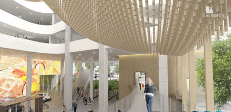 大厦较低的楼层将设置办公室,上面是一座500间客房的豪华饭店,其漂亮的空中大堂位于70层,将迎接着宾客的到来。他们可以穿越茂密的竹林来到开放式的大堂,并欣赏到太平洋的壮丽景色、好莱坞的标志以及Griffith天文台等。