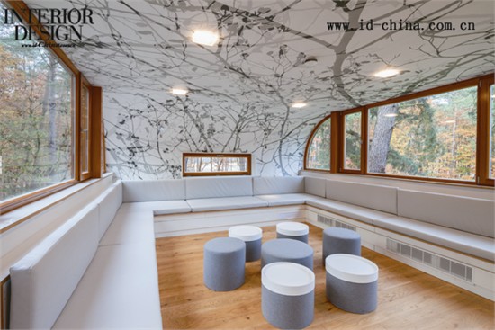 低处的楼梯和连接处的平台通过钢质绳索依靠在一棵松树上。结构和周围的环境和谐共处,没有任何的突兀感。树屋内所有细节按照功能性进行设计,相对低的小屋里有咖啡吧、卫生间、餐厅和设备房,较高的是会议室。会议室三面都是舒适的坐垫长椅,让人们可以在此享受到窗外无尽的风景,有些窗户贴心地做了导圆处理,完美地贴合整个外观。墙上手绘的猎犬、树枝和树叶将室外的自然风景延续至室内,这一重要的元素体现了会议室最核心的价值——可持续发展和现代感。