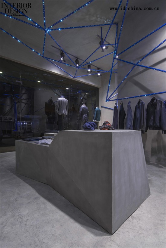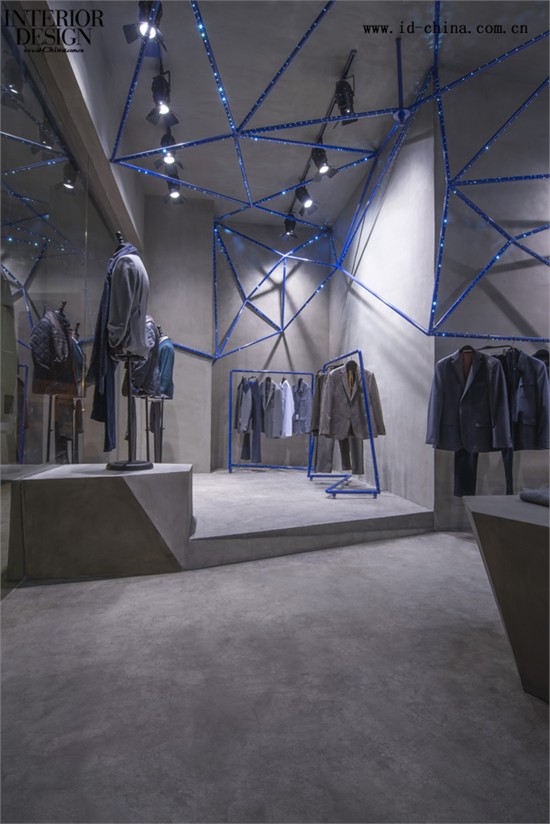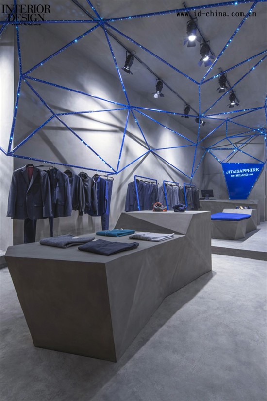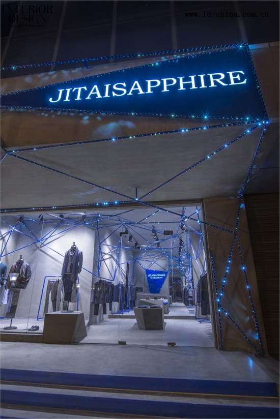 ANDREWMARTIN(安德鲁马丁)国际室内设计大奖得主阔合总监林琮然,受邀设计全球首家JITAISAPPHIRE实验店,空间延续品牌意念,试图创造永恒且独立的极简感受,建筑师与JITAISAPPHIRE男装总监对话,提出了光之廊的概念,研究八心八箭又名邱比特车工,把钻石的切割比例解构为空间的密码,让代表邂逅、钟情、暗示、梦系、初吻、缠绵、默契、山盟这八个美丽意境与空间结合,产生蓝线分割空间以表达那男人最美丽的承诺,线条在空间内飞舞展出了几何构线,配合服装呈现出三度立体陈列观感,再由地面切分出的水泥多角块体,制造出高低有致的中岛与服务台,完美表现空间多重视觉的变化性,开创服装店一种经典与时尚美感。