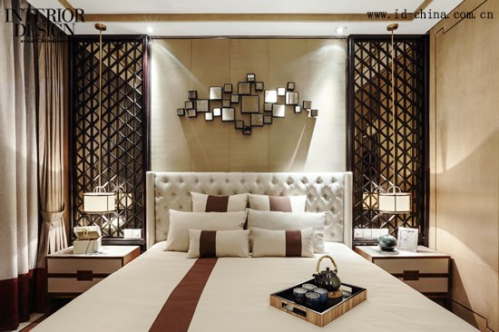 卧室以舒适安静为设计目标,色调上延续整体的棕色,以浅棕和米色烘托氛围,黑色木格配以典雅造型的灯具装饰床头,点睛中式风格主题。静谧的卧室为主人打造出一方私密空间,沉稳的色调正如主人的稳重气质,不张扬却有着深厚的内涵。